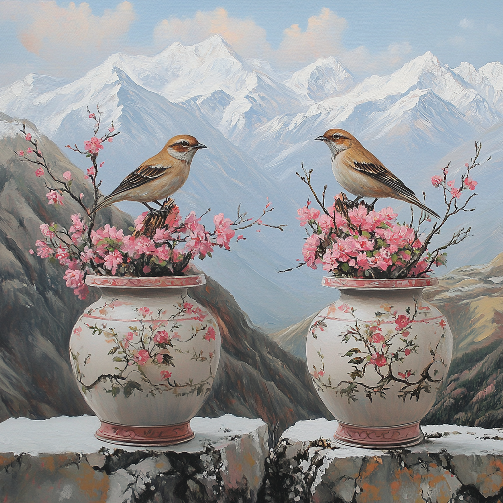 Snow Covered Mountains with Two Birds and Flowers Diamond Art Kit